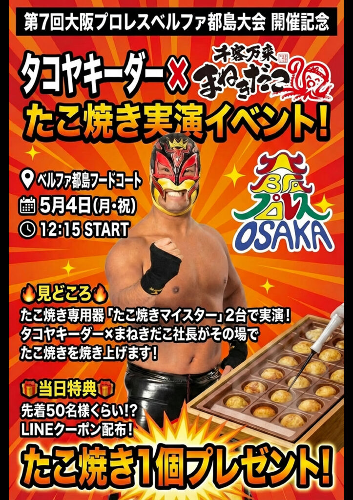 | イベント名 | 第7回大阪プロレスベルファ都島大会 開催記念 たこ焼き実演イベント |