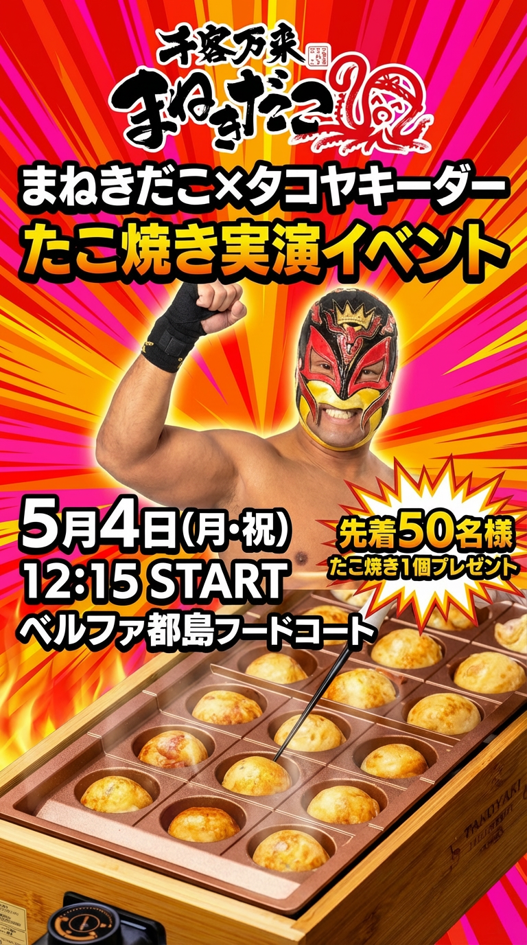2026年5月4日(月・祝)、ベルファ都島 にて開催される 第7回大阪プロレスベルファ都島大会 にあわせ、千客万来まねきだこによる特別イベントを開催いたします。